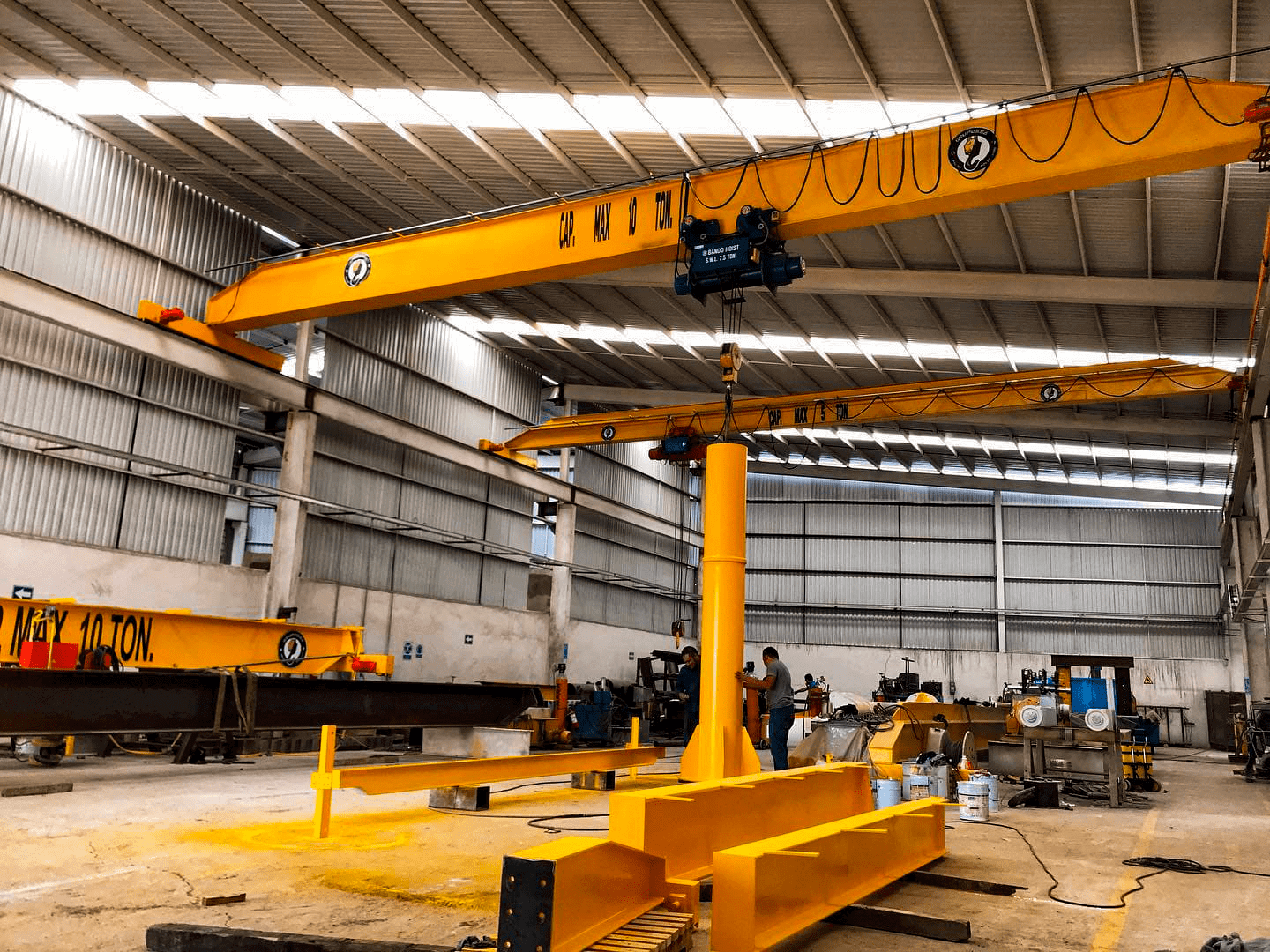 Equipo industrial que se desplaza por rieles elevados para levantar y mover cargas muy pesadas.